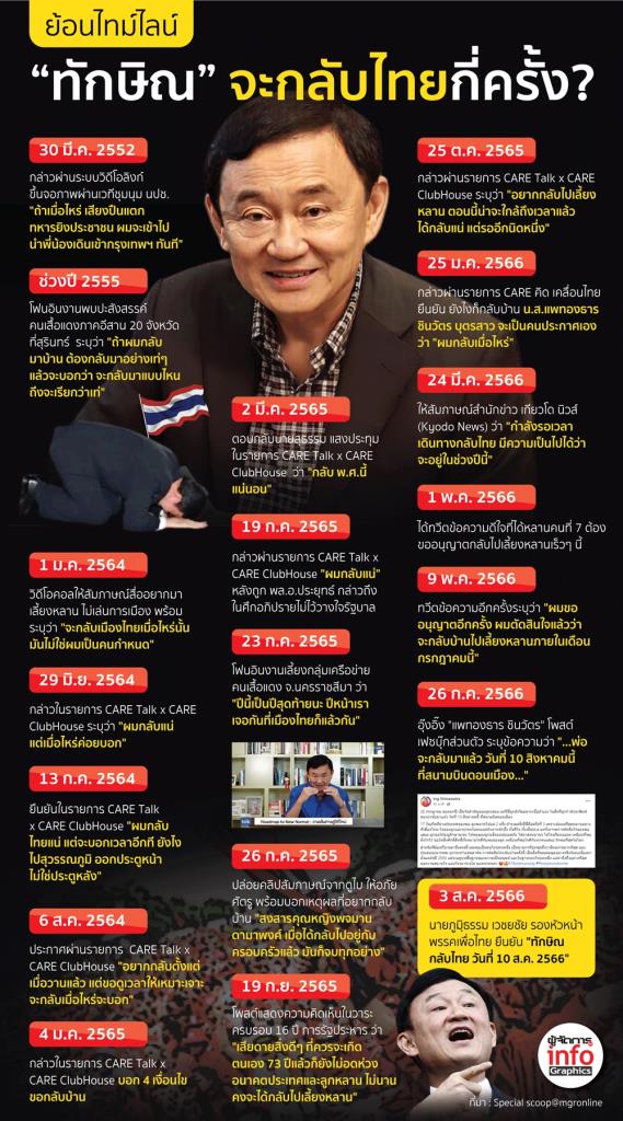 ขณะที่เรื่องกลับไม่กลับของนายทักษิณ ยังคงเป็นประเด็นเชื่อมโยงกับสถานการณ์การเมืองเพราะเมื่อวันที่ 2 ส.ค.ที่ผ่านมา พรรคเพื่อไทยได้ฉีก MOU 8 พรรค ถึงขนาดมีเสียงครหาว่า พรรคเพื่อไทย ถีบหัวส่งพรรคก้าวไกลไปเป็นฝ่ายค้าน พร้อมกับมีม็อบไปเผาหุ่นที่พรรคเพื่อไทย มีการตะโกนต่อว่าพรรคเพื่อไทยที่แยกตัวออกมาเพื่อเป็นแกนนำในการตั้งรัฐบาลข้ามขั้ว ทั้ง ๆ ที่ประกาศอยู่ฝ่ายประชาธิปไตย และทำลายความหวังของประชาชนหมดสิ้น