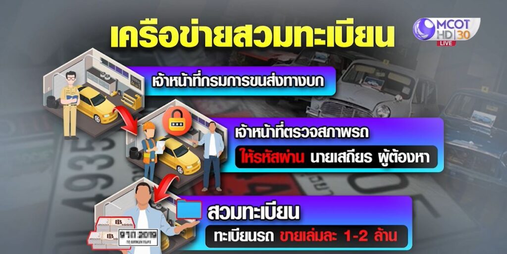 ทีมข่าวสำนักข่าวไทย พาย้อนไปดูจุดเริ่มต้นของเครือข่ายสวมทะเบียนนี้ เจ้าหน้าที่บอกว่า ต้องมีคนในกรมการขนส่งทางบกเป็นคนเปิดทางให้ รู้เห็น ให้รหัสผ่าน แก่นายเสถียร ผู้ต้องหา เพื่อเข้าไปแก้ไขข้อมูลเล่มทะเบียนรถ หรือสวมทะเบียน ก่อนนำไปขายเล่มละ 1-2 ล้านบาท